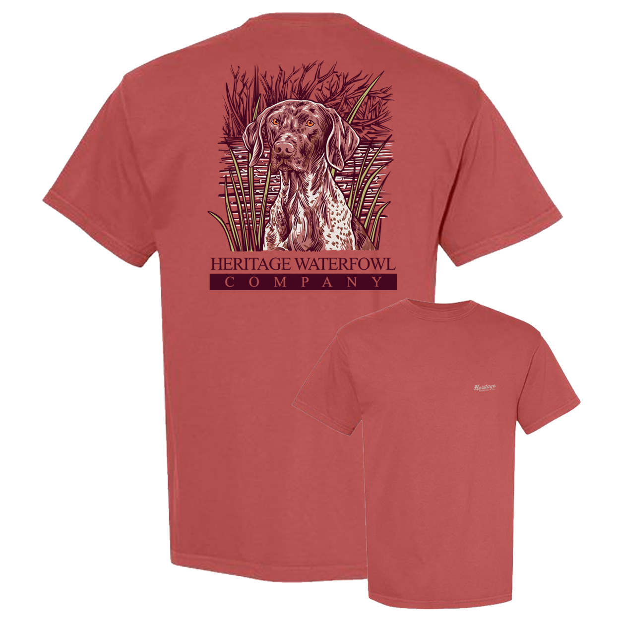 Featuring a detailed back design of a German Shorthaired Pointer in the marsh, paired with the Heritage Waterfowl Co. logo, this shirt is a must-have for hunters, dog lovers, and outdoorsmen alike. The front chest carries a subtle Heritage Waterfowl logo for a clean everyday look.